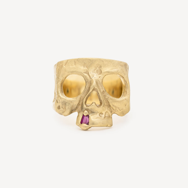 This skull and crossbones ring is crafted in yellow gold and set with a rose-colored sapphire.