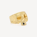 This skull and crossbones ring is crafted in yellow gold and set with a black sapphire.