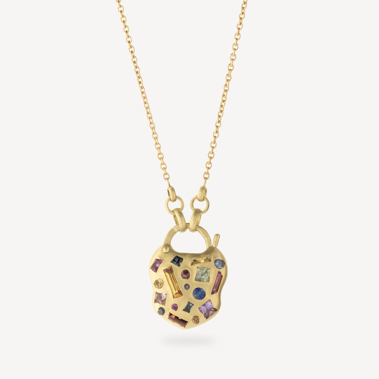 This necklace embodies understated, luxurious elegance, finely blending sapphires with the shimmering hues of a rainbow. These stones, with their expertly integrated mixed cuts, come to life in a double-sided padlock pendant. Its active hinge closure offers a modern, practical touch to this jewel, suspended with grace from an 18-carat recycled yellow gold forçat chain. This refined piece harmoniously combines luxurious exclusivity with warm accessibility, adding captivating elegance to your style.
