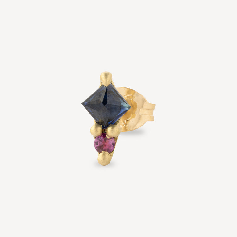 Explore the distinguished sophistication of this blue and pink sapphire princess-cut buckle, meticulously set in an elaborate geometric-shaped stud, highlighted by an 18-carat recycled yellow gold pin clasp and butterfly closure. This piece embodies the perfect alliance between the brilliance of precious gems and the nobility of metal, offering a touch of exquisite luxury while remaining accessible and welcoming.
