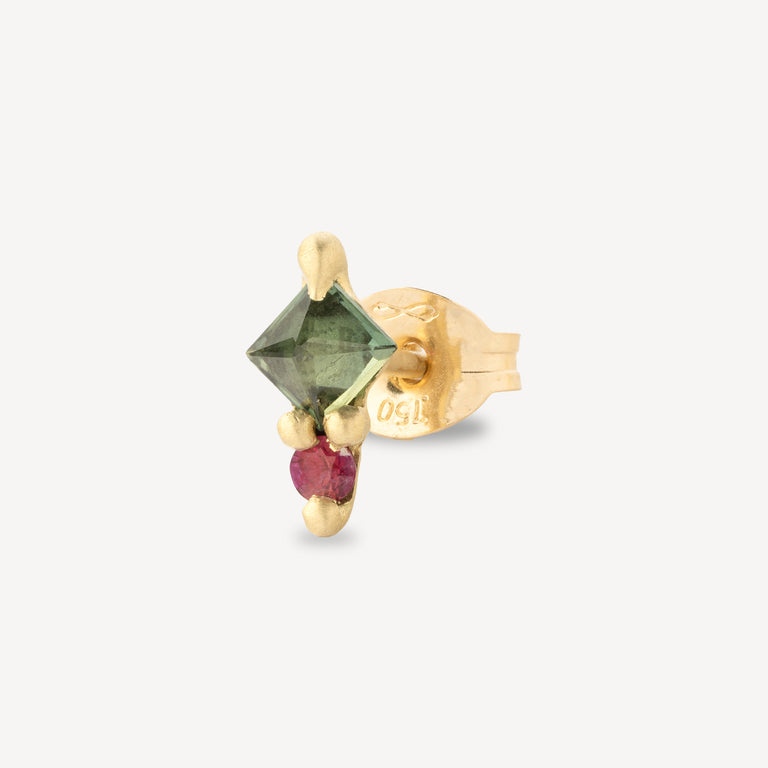 Explore the refined elegance of the princess cut in water-green sapphire and round pink sapphire, meticulously set in a geometrically patterned stud. The jewel is completed by a butterfly clasp in 18-carat recycled yellow gold. This creation harmoniously combines the splendor of gems with the timeless nobility of precious metal, offering a delicate touch of luxury while retaining a warm conviviality.