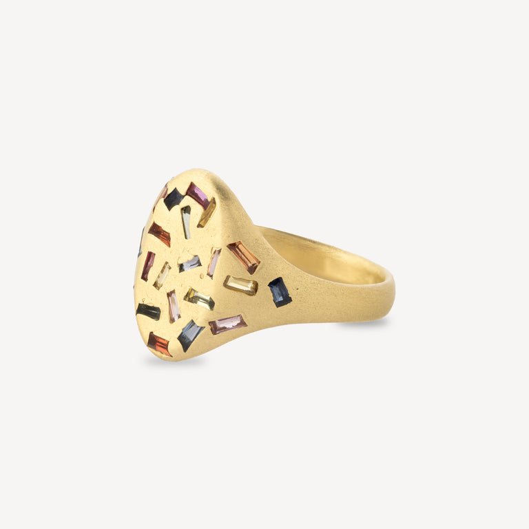 Explore the exquisite radiance of rainbow-hued baguette sapphires, skilfully integrated into a signet ring crafted in 18-carat recycled yellow gold. This piece subtly combines the shimmering brilliance of precious stones with the timeless nobility of metal, embodying a harmonious marriage between distinguished luxury and a warm, accessible touch.