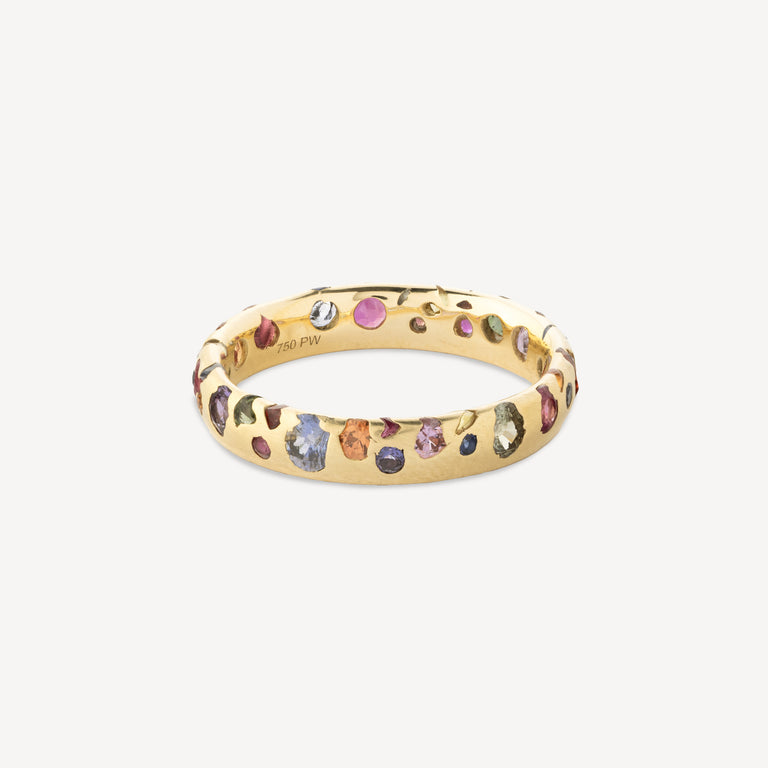 Discover the celebration of destiny and spontaneity with this splendid narrow Confetti ring, a true icon adorned with rainbow sapphires and crafted in 18-carat recycled yellow gold. This creation reveals dazzling magic from every angle. Let yourself be enchanted by the shimmering brilliance of multicolored sapphires and the timeless nobility of gold, a perfect harmony of luxury and joie de vivre.