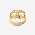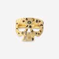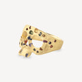 Explore the enchanting world of Confetti rings with this splendid, iconic skull and crossbones ring. It embodies the magic of rainbow sapphire confetti and a white diamond tooth, all meticulously crafted in 18-carat recycled yellow gold. This creation fuses the shimmering brilliance of precious stones with bold design, embodying a perfect marriage of exquisite elegance and a playful touch.
