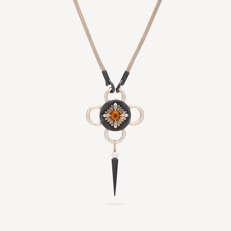 The Bolt necklace features a citrine. The central flower in polished Silver rests on a satin-finish blackened Silver plate. A blackened Silver tassel topped by an Akoya pearl completes the rosette. Citrine radiates solar energy, stimulating joy, creativity and self-confidence.