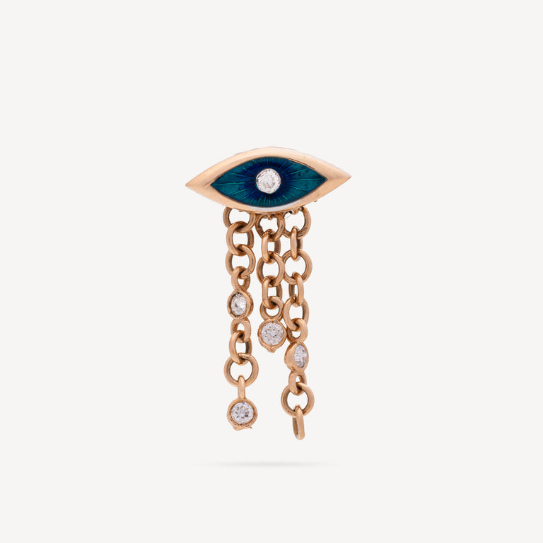 This Evil Eye Chain earring in Rose Gold is beautifully decorated with an enamel eye adorned with three chains of white diamonds.