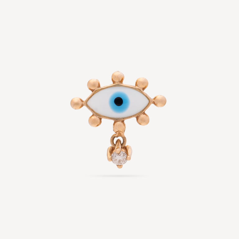 This Evil Eye earring in Rose Gold is beautifully decorated with a white enamel eye and a loose diamond.