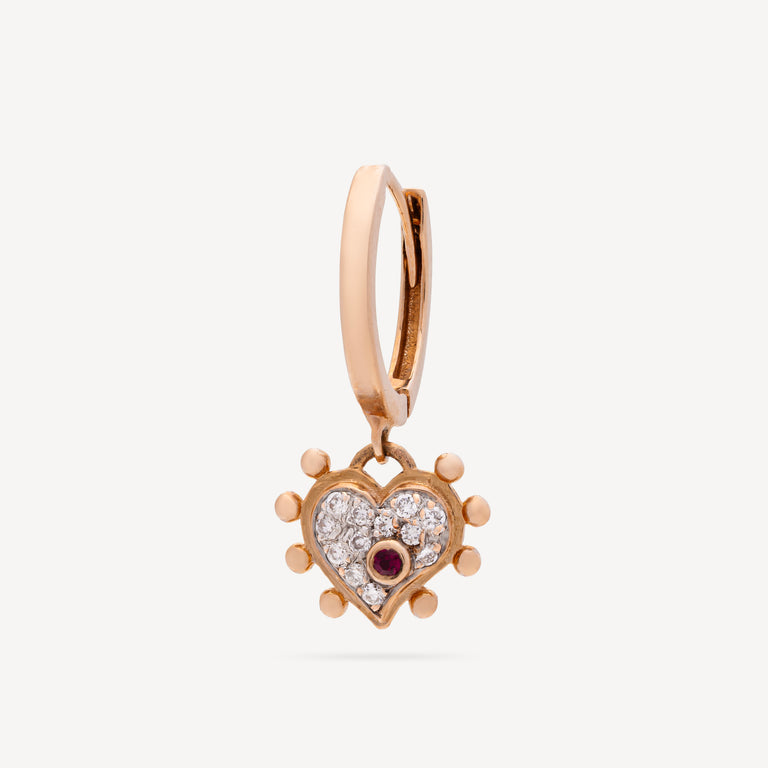 Made of high-quality Rose Gold , this Selda earring features a delicate heart adorned with white diamonds and a dazzling ruby.