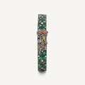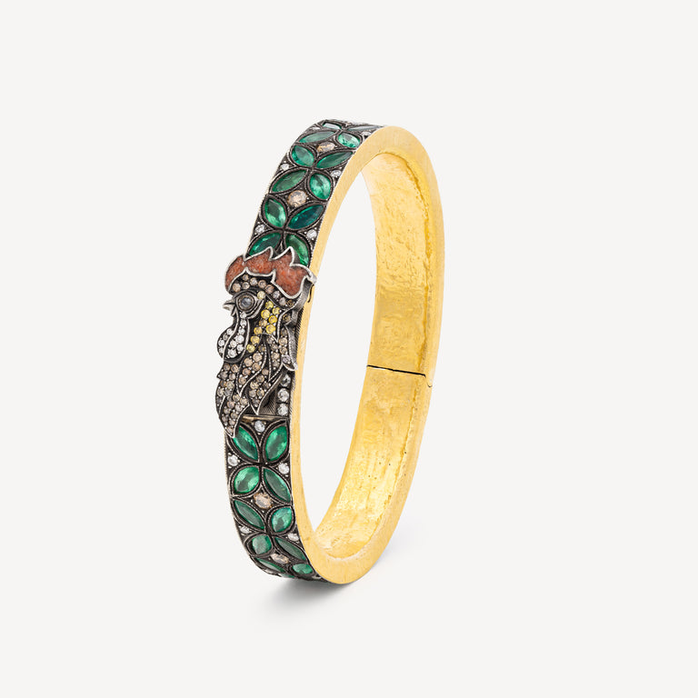 This yellow gold bracelet features a graceful bird on your wrist. Adorned with a delicate pavé of emeralds and diamonds, this bracelet will add a touch of elegance and sophistication to your outfit.
