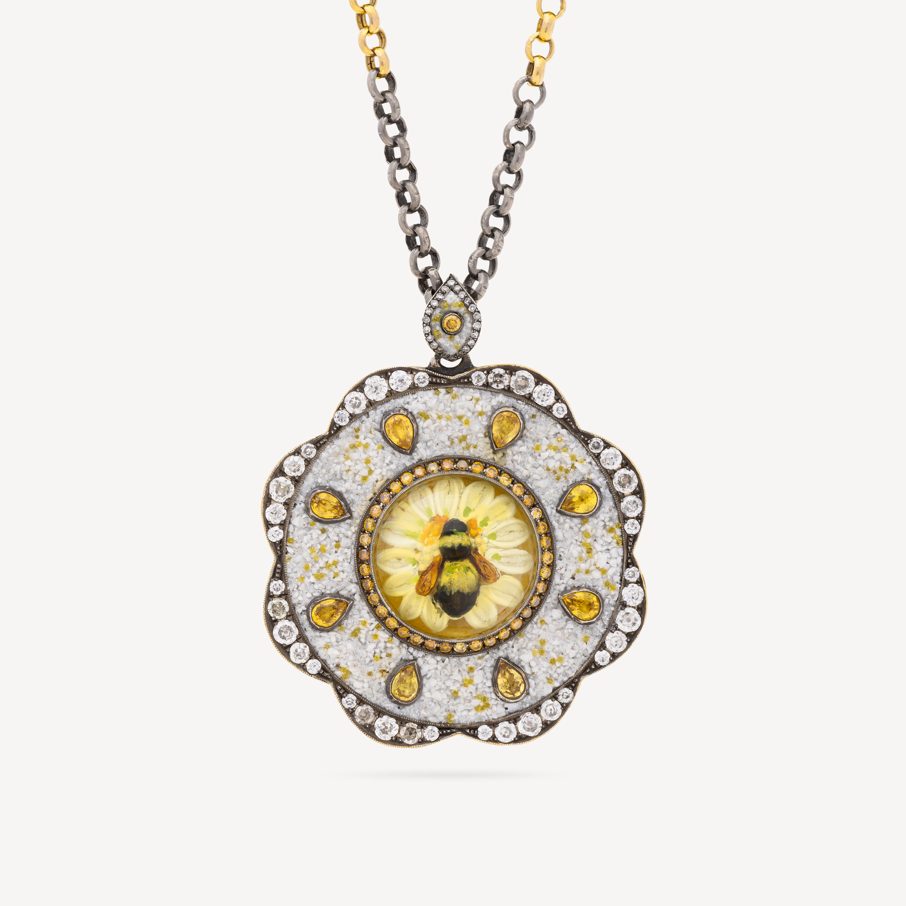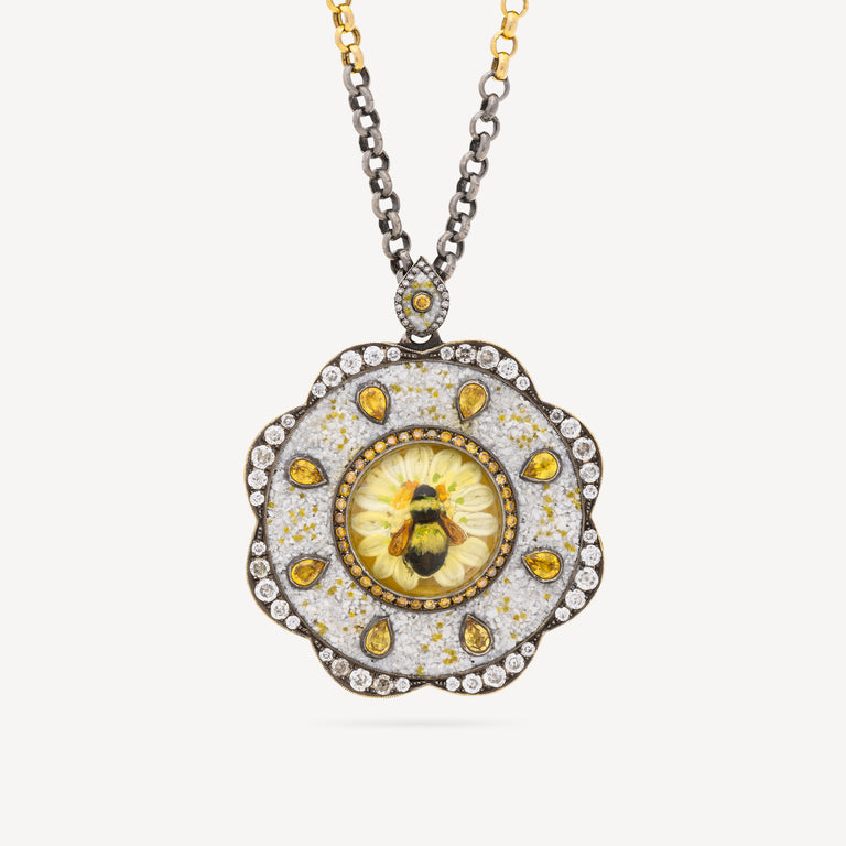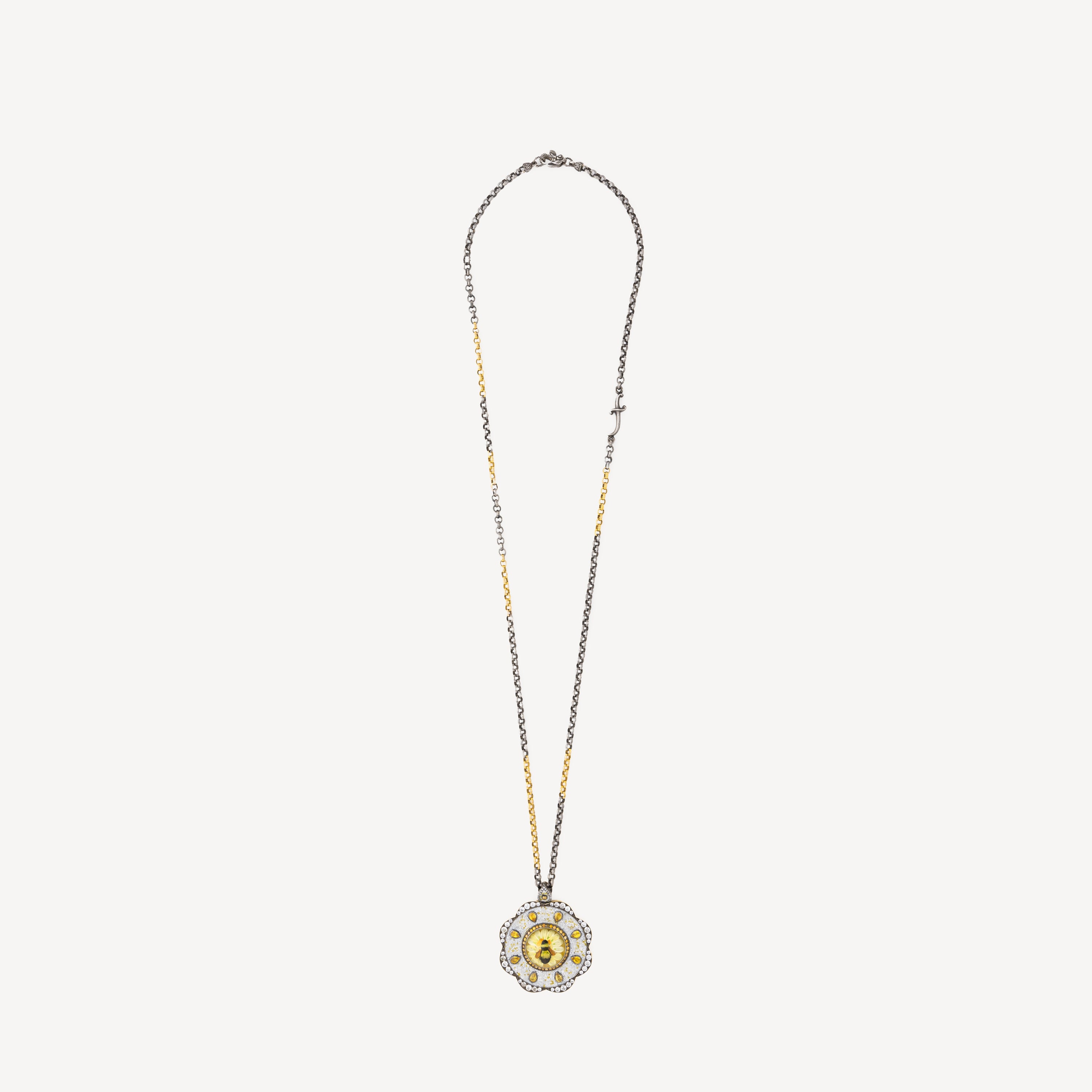 This magnificent necklace in Silver and yellow gold features a large medallion representing a bee. Its high-quality design and sparkling diamonds make it a unique and timeless piece of jewelry.