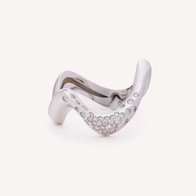 Crafted in 18-carat brushed white gold, the Swoon ring embodies fluidity and grace. Its sculptural design, enhanced by delicate round diamonds, creates a captivating interplay of textures and brilliance.