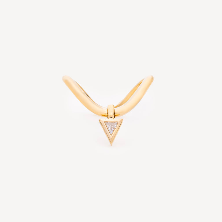 Catalan architect Antoni Gaudí is famous for his modernist style, both poetic and avant-garde, driven by a relentless quest for perfection. Shahla Karimi's Gaudi Curve Golden Triangle ring pays homage to the Sagrada Família: its band hugs a catenary arch supporting a trilliant diamond set in a delicate articulated bezel. The golden triangle, symbol of divine harmony, evokes the union of the sacred and the natural so dear to Gaudí. A stone of clarity and elevation, the white diamond inspires purity and inner strength.