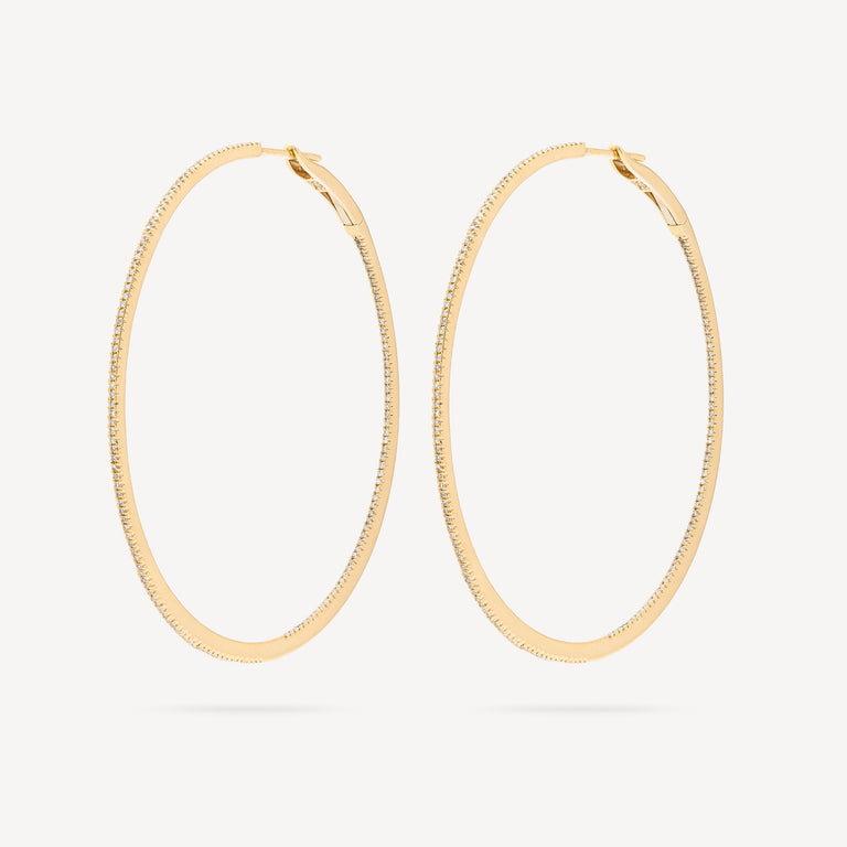 These earrings feature diamonds on both the outside and inside of the hoop, offering complete brilliance from every angle. Shine inside and out with these pavé earrings.