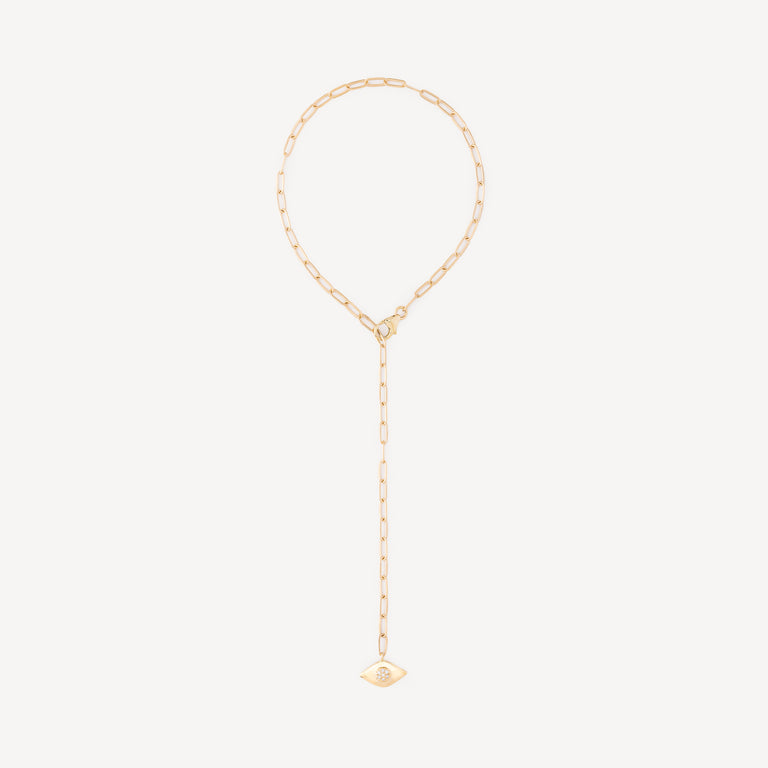 This 18ct yellow gold anklet is adorned with an "evil eye" pendant encrusted with white diamonds. Add an elegant, protective touch to your look with this refined piece of jewelry.