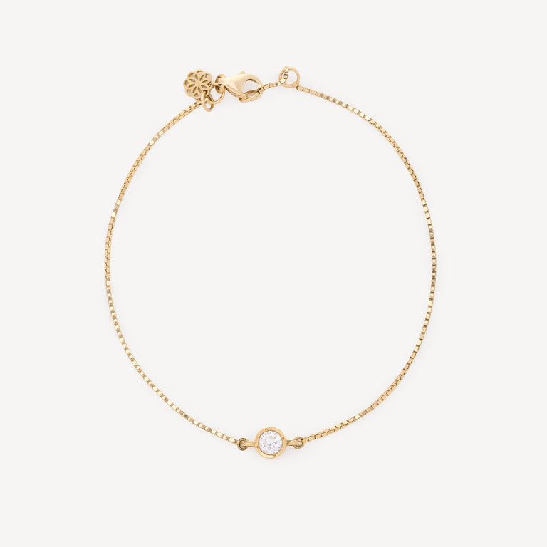 The Lev bracelet features an exquisite 18 Ct yellow gold chain set with a 3.5 mm brilliant-cut diamond in a closed setting. Perfect for everyday wear, this classic look exudes natural elegance and refinement.
