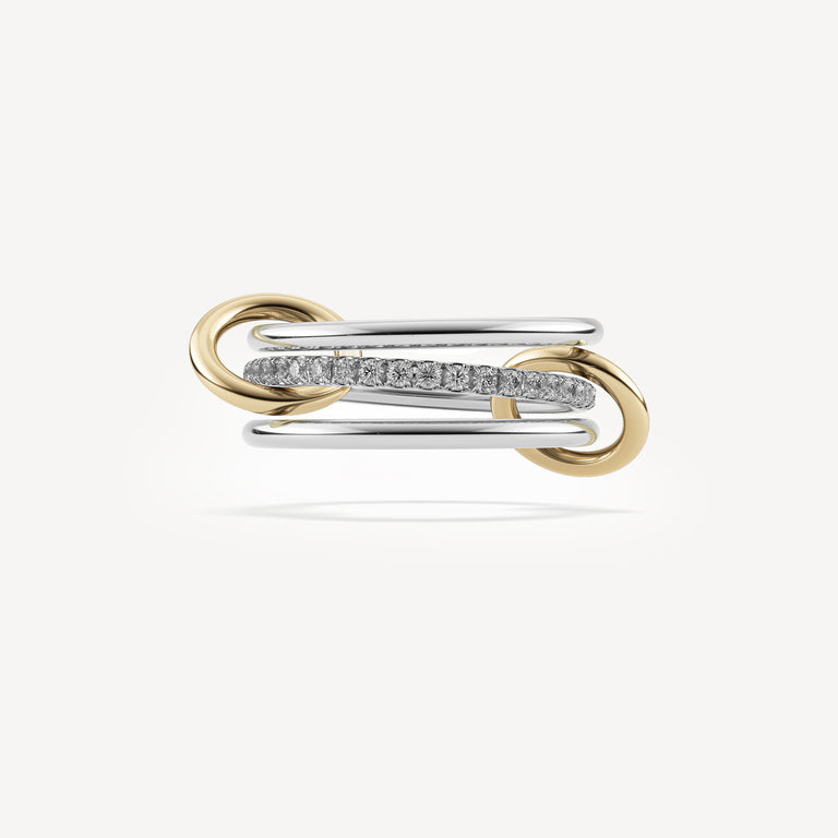 The Sonny ring combines simplicity and sparkle. Its central ring paved with white diamonds is framed by two luminous 18ct gold rings, linked by matching connectors. With its slender 1.7 mm rings, it's ideal for stacking and perfect for everyday wear.
