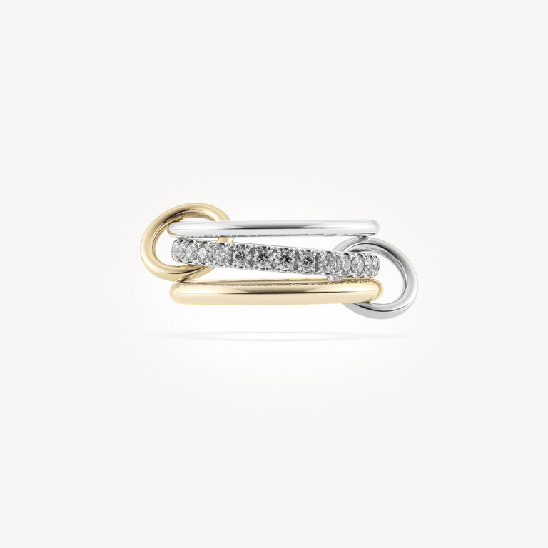 The Petunia ring, with its diamond-set center ring, is framed by two matching metal rings. Mobile connectors bind the ensemble together for a sculptural piece ideal for everyday wear.