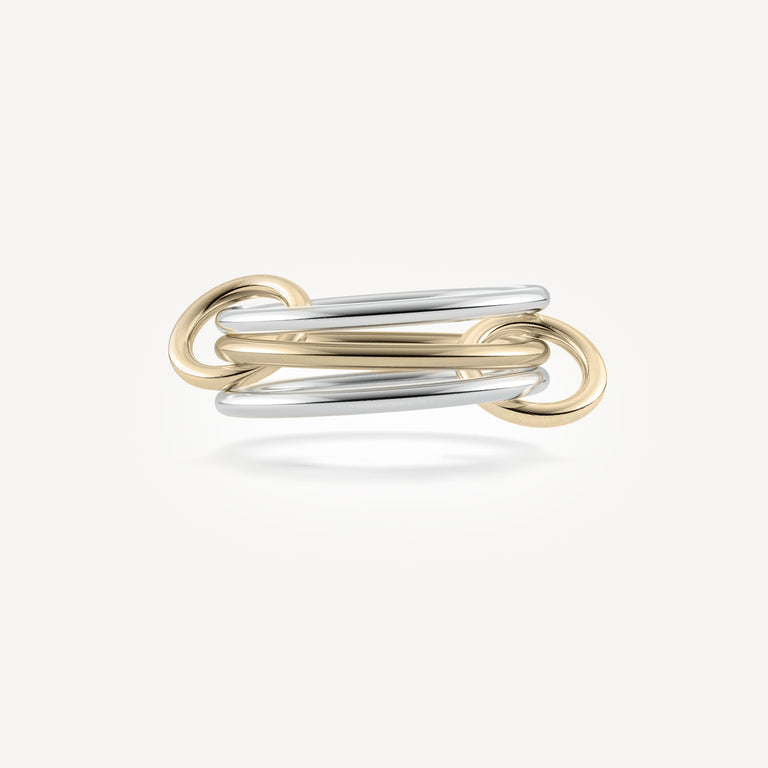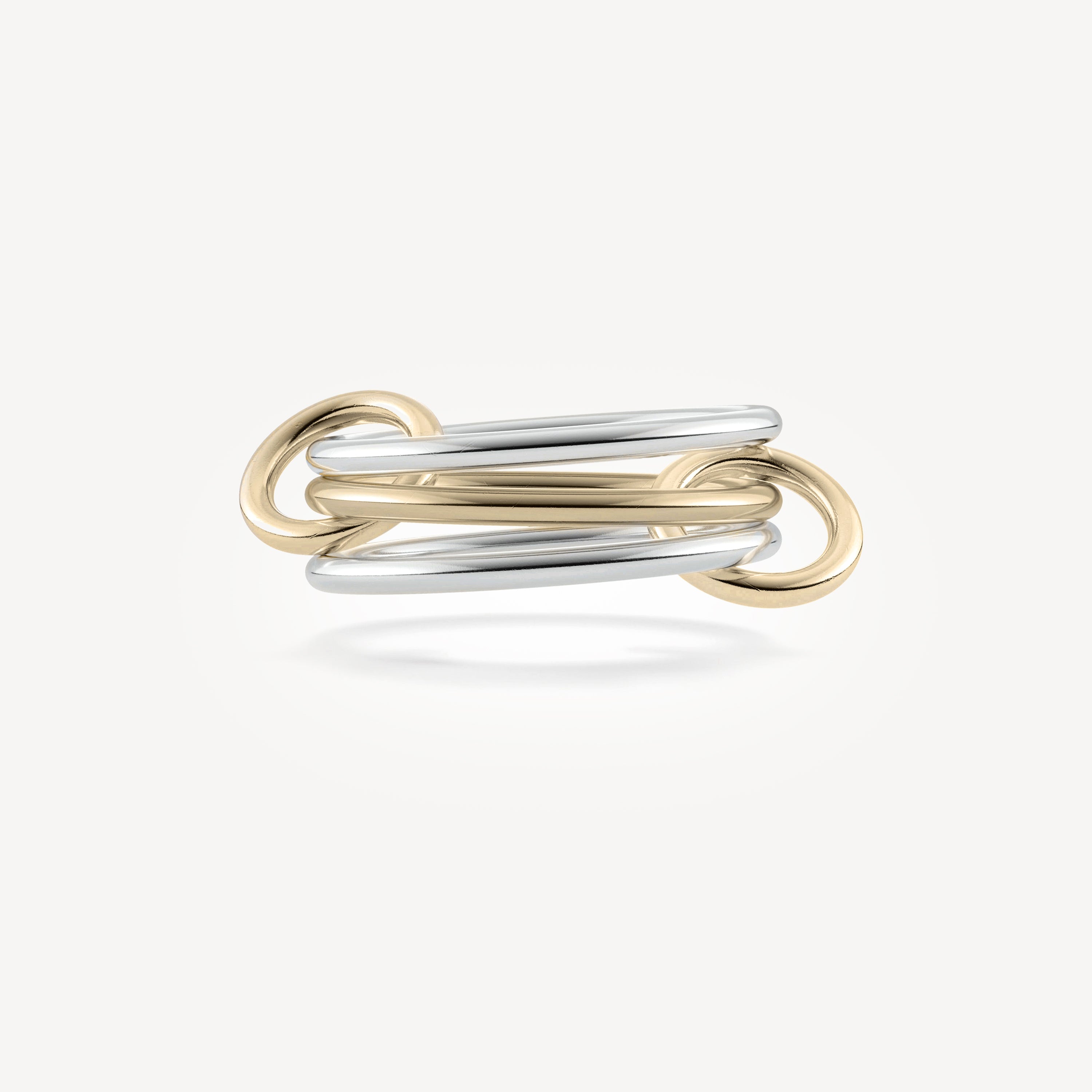 The Solarium ring plays on luminous palettes, plain or multicolored, with slim, elegant bands and connectors. Its modular design allows it to be worn on one or more fingers.