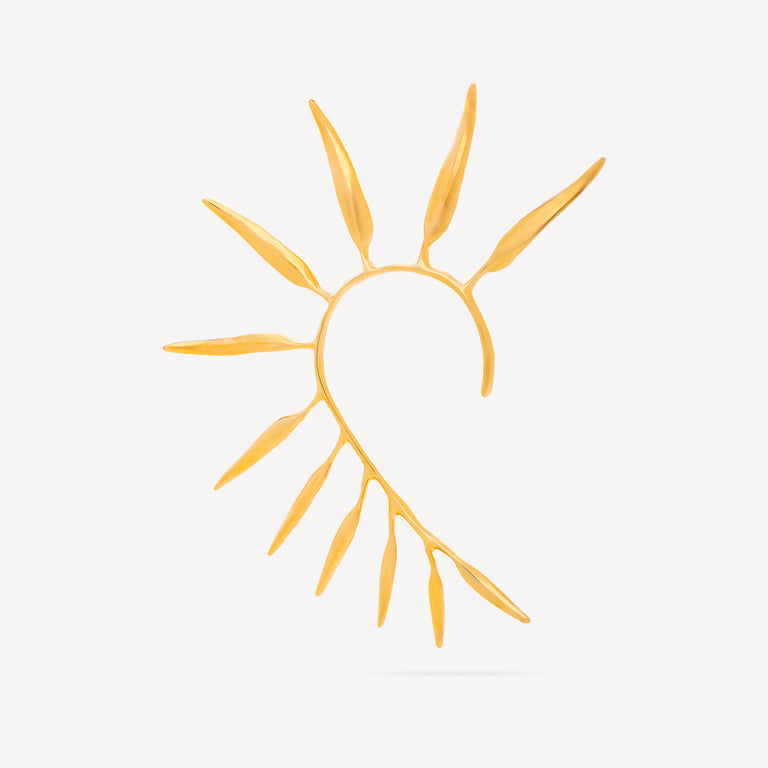 Rigid earring, fern motif, 24-carat yellow gold-plated brass base. Ferns are the oldest known plants, Suma Cruz's allegory for their importance and elegance. Our most emblematic earrings, their sinuous shape hugs the oval of the face, emphasizing its beauty.