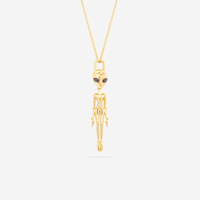 The She's an alien necklace is crafted in 18-carat yellow gold and features a captivating combination of sparkling white sapphires and diamonds that shine with cosmic intensity. White diamonds protect against negative energies, encourage inner harmony and develop strength and determination. The sapphire symbolizes truth, wisdom, fidelity and peace.