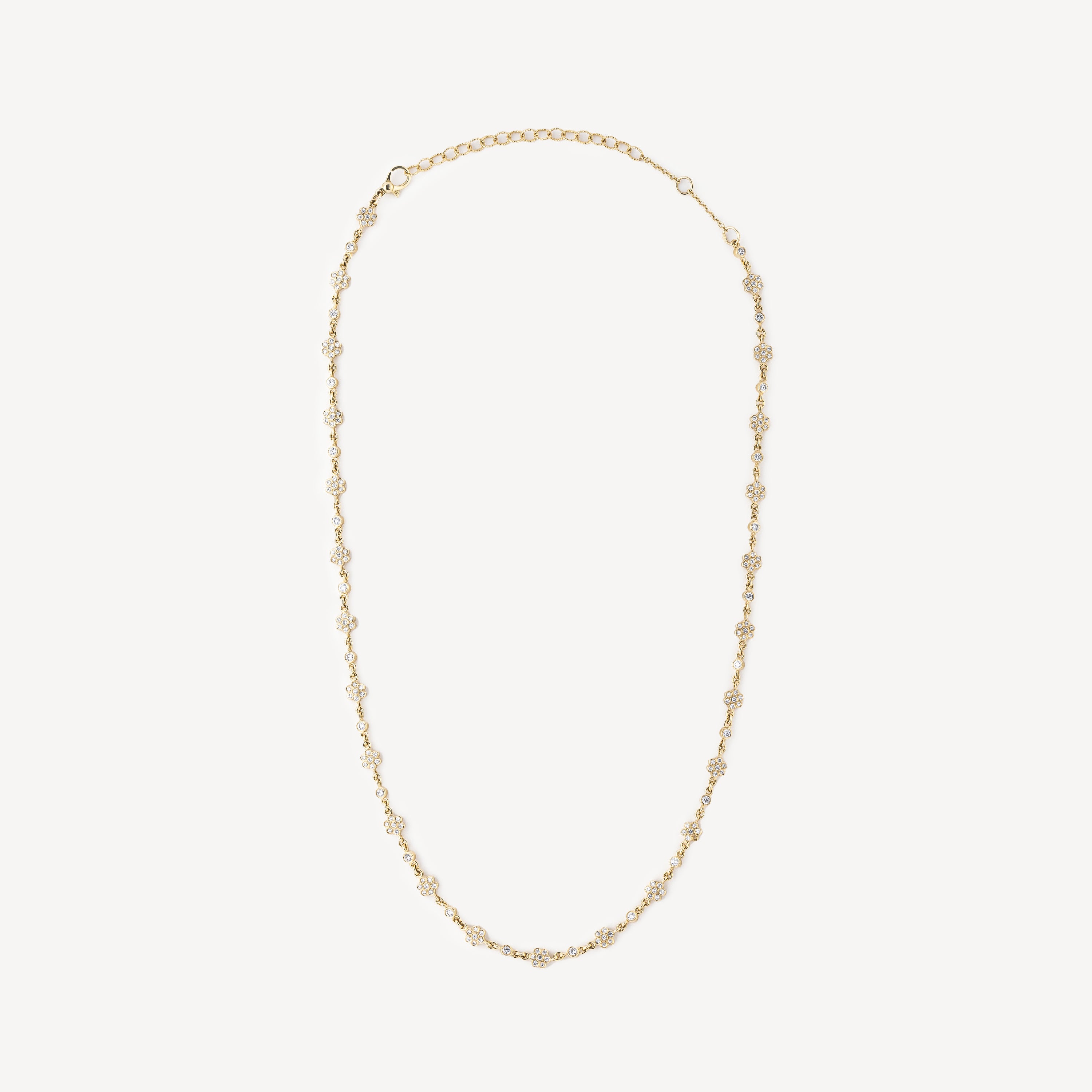 This Chamomile Tennis Choker is a delicate piece of jewelry in yellow gold adorned with diamond-paved flowers.