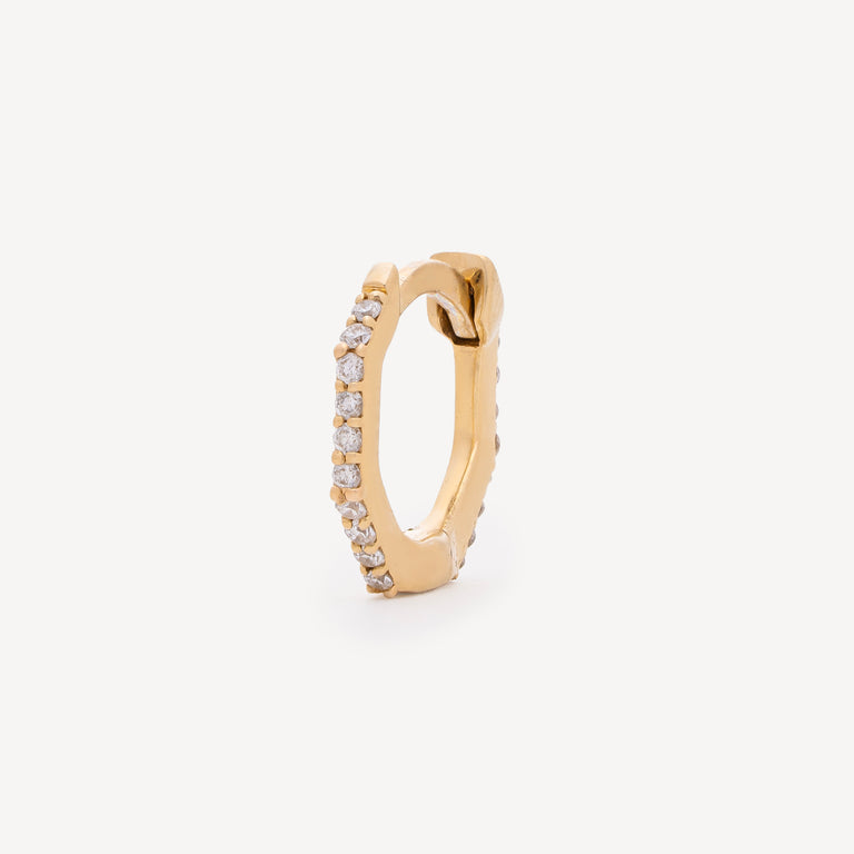 The octagonal Hoop Five is crafted in 14-carat yellow gold and delicately set with small diamonds. A symbol of eternity and light, diamonds elevate energies, enhance mental clarity and inner strength, and bring balance and purity to the wearer.