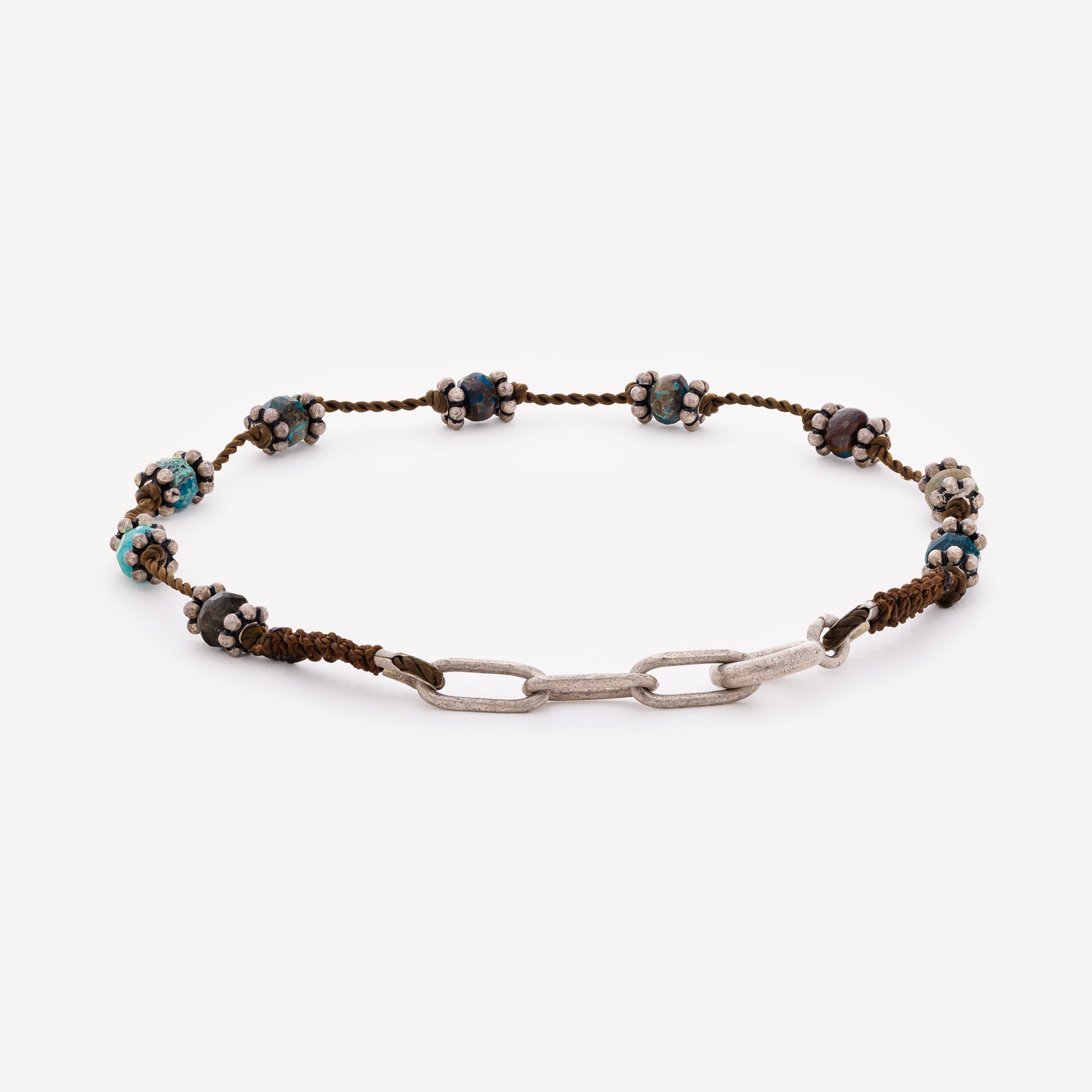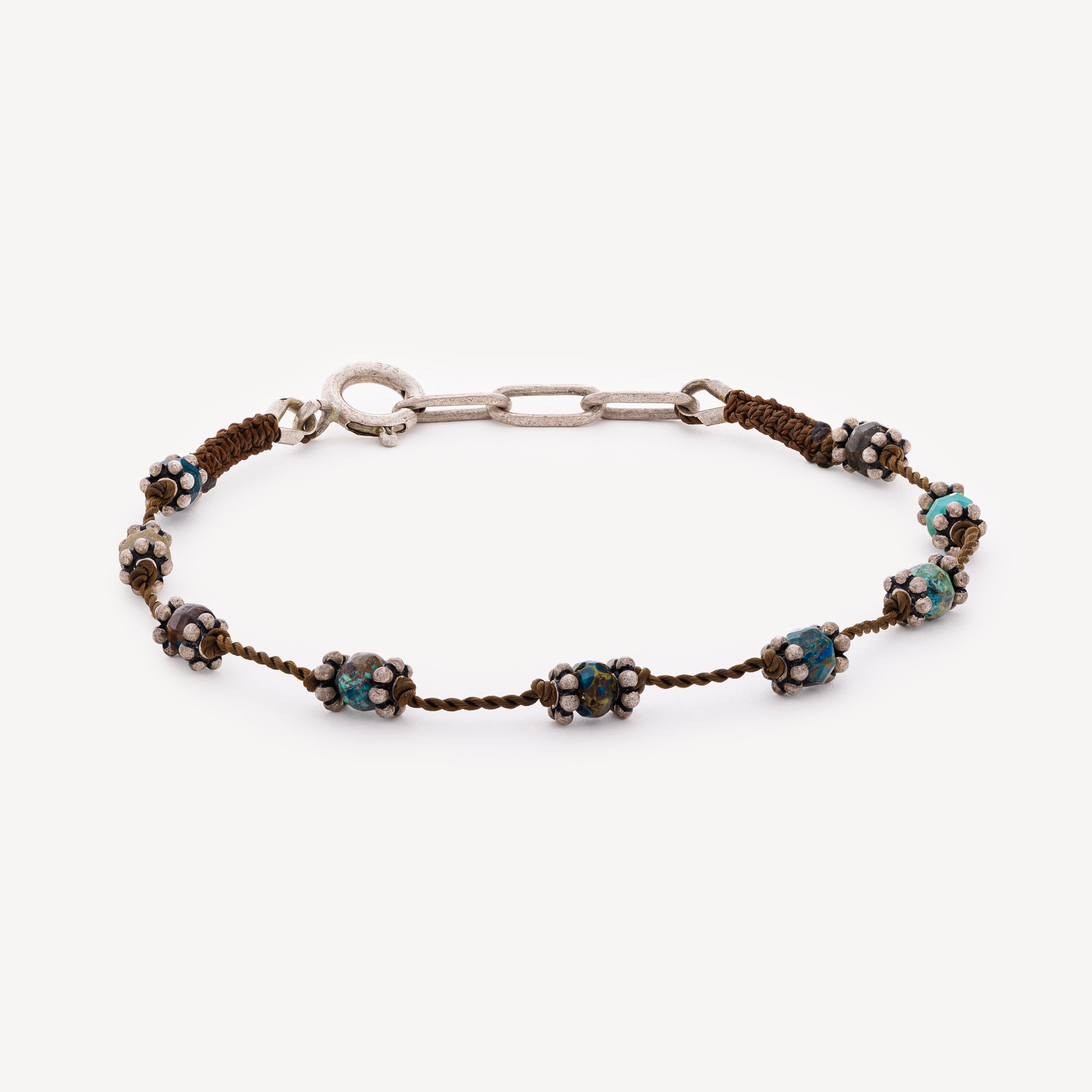 Bracelet mounted on a brown cord set with small Silver stones and chrysocollas.