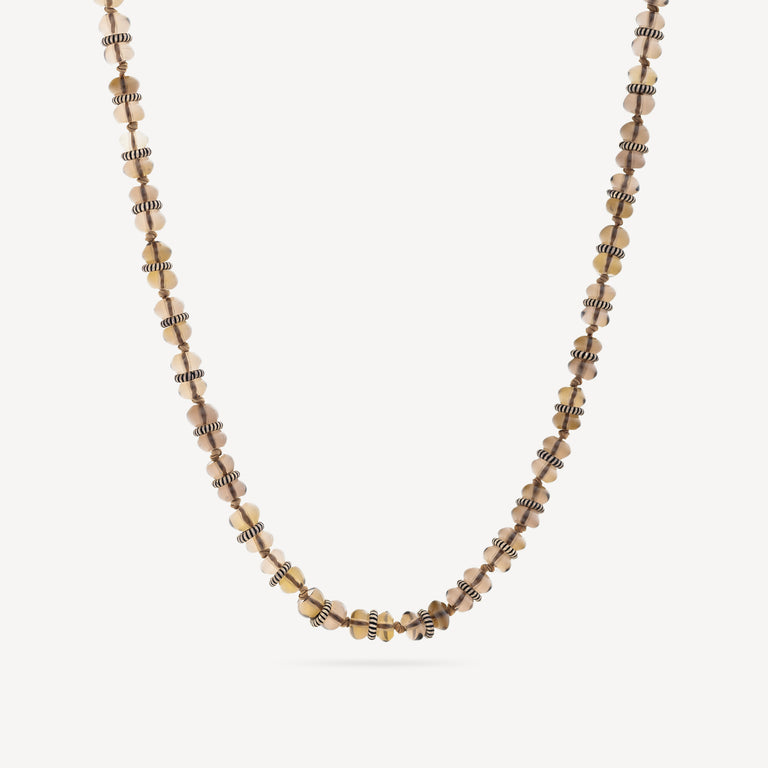 Silver necklace with smoky quartz beads. Mounted on a beige cord.