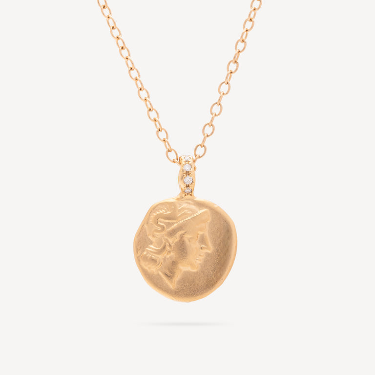 Charming necklace in 18K gold, adorned with an engraved medallion and pavé-cut white diamonds for a touch of timeless radiance.