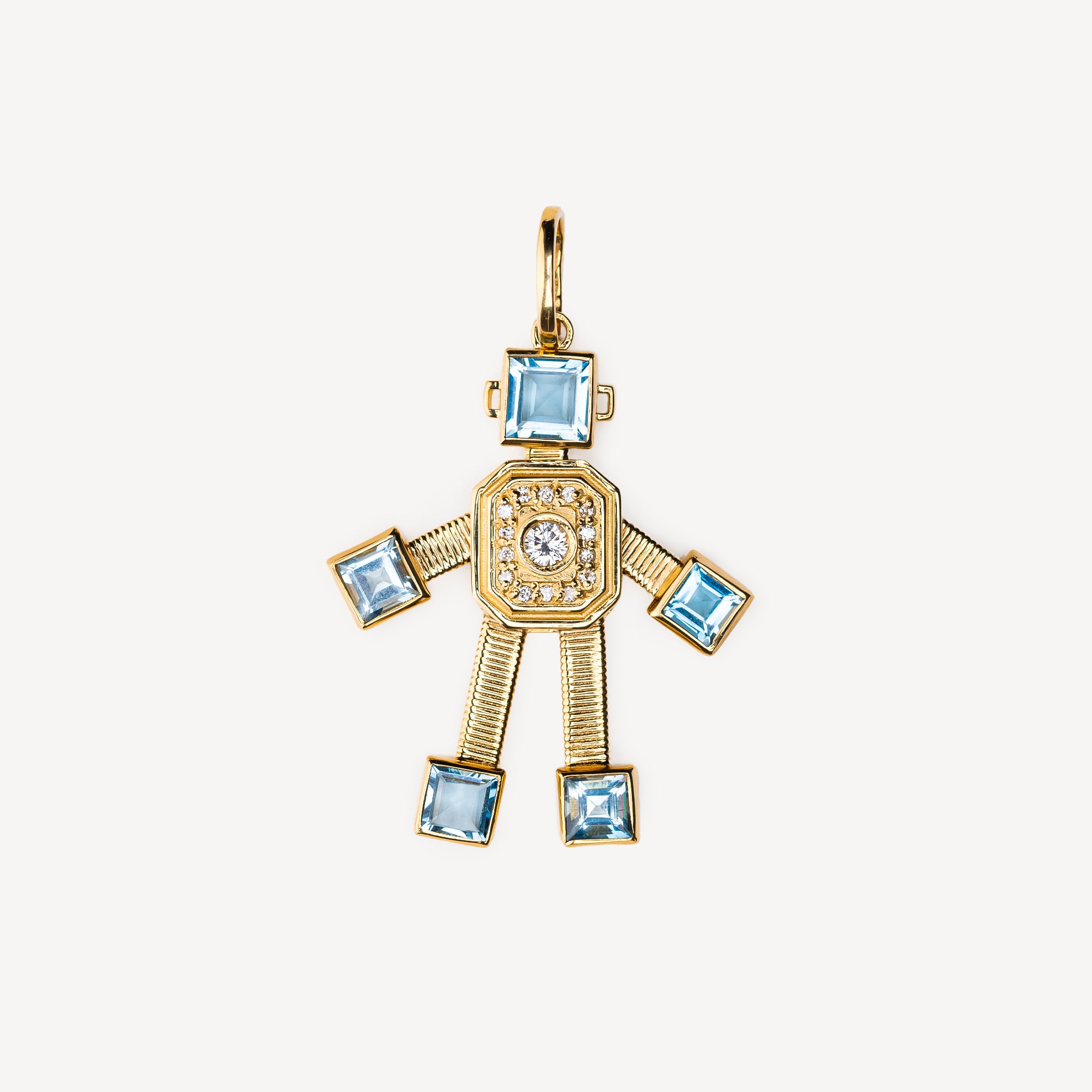 The Van Heart articulated pendant by Van Robot is a refined creation handcrafted in Italy. This delicate piece combines the elegance of yellow gold with the sparkle of diamonds and the soothing hue of aquamarine. A fine jewelry piece for those who appreciate subtlety and craftsmanship.White diamonds symbolize clarity and spiritual strength, while aquamarine spreads serenity, renowned for its soothing virtues.
