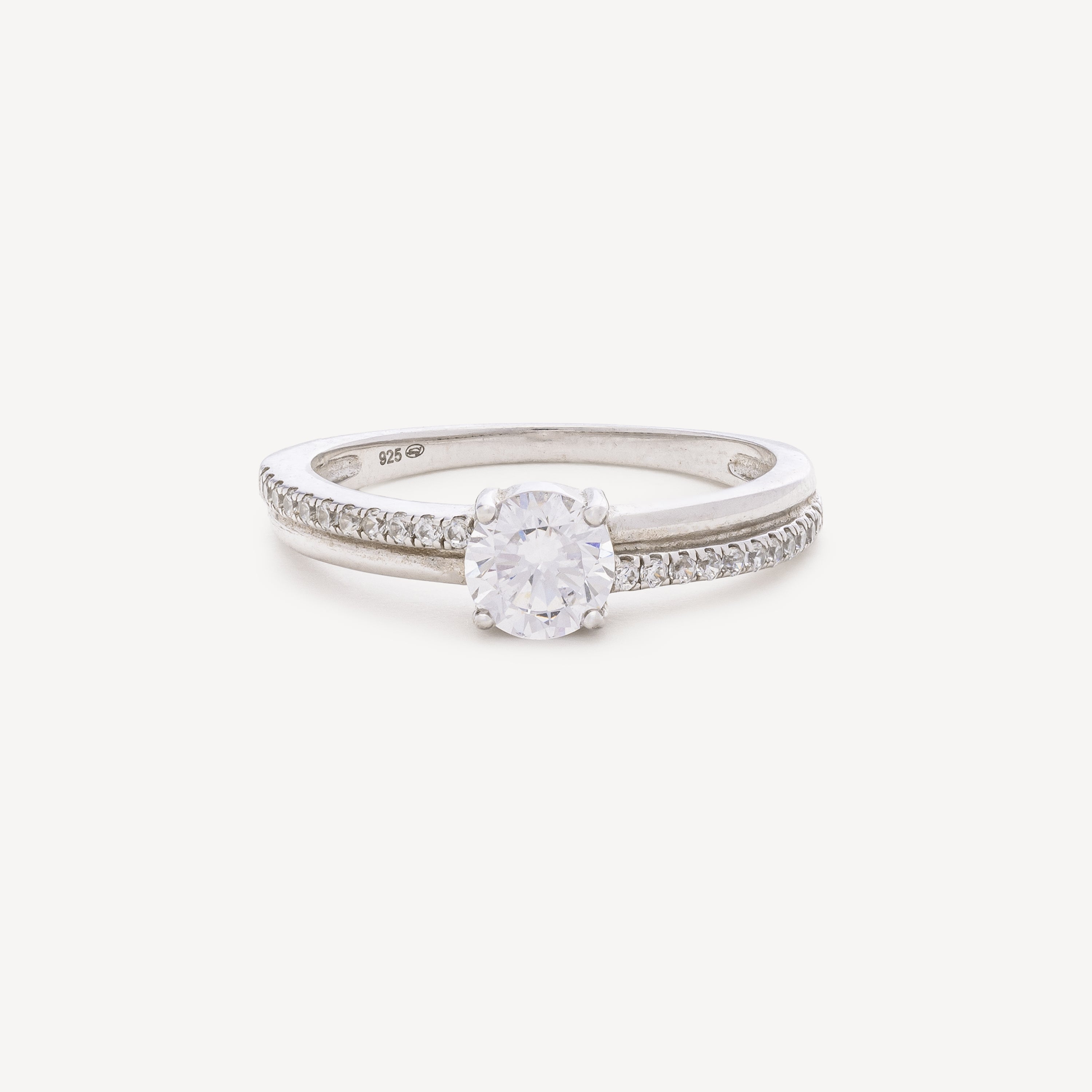 Silver solitaire ring with double rows set with zircons and a central zircon.