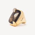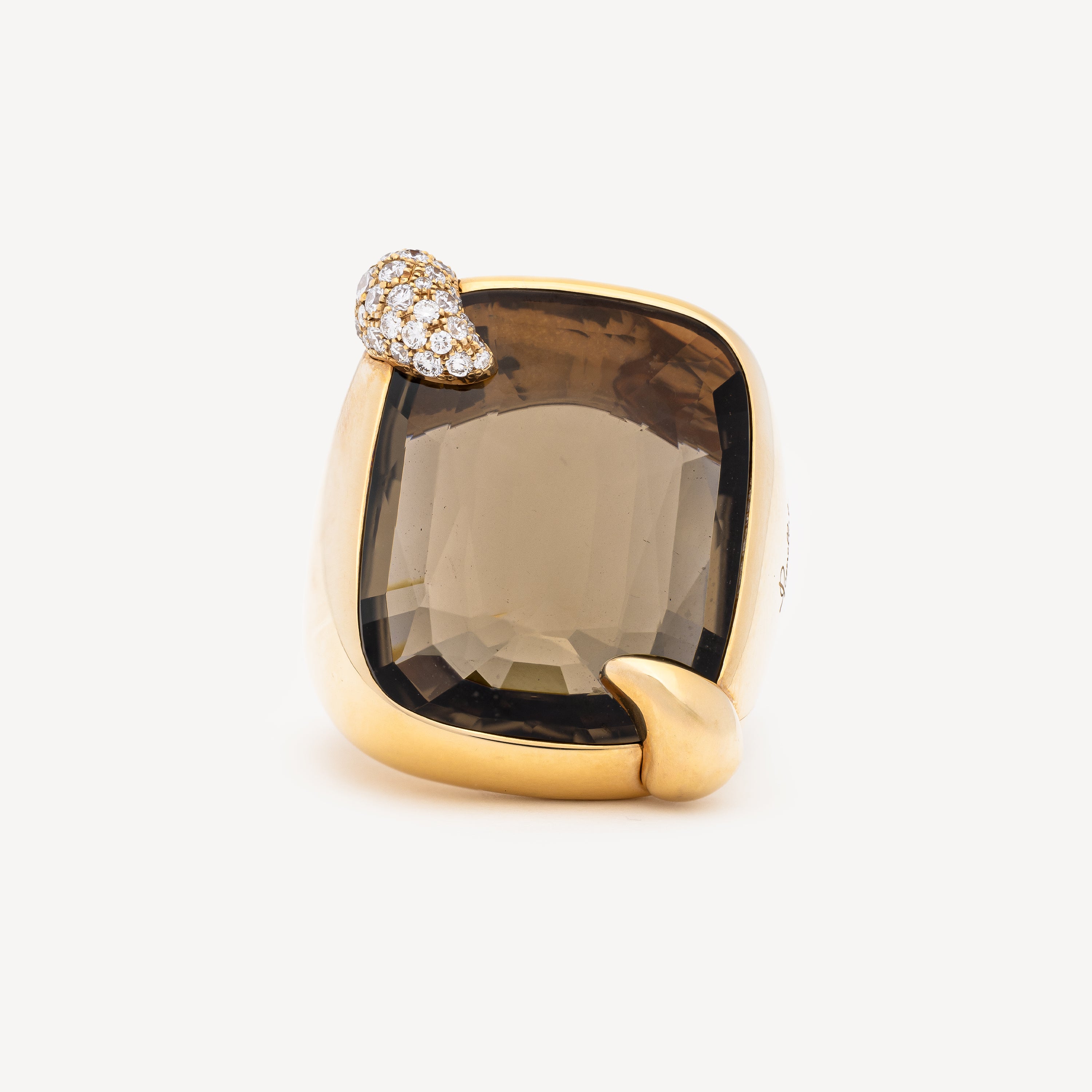 Yellow gold maxi ring set with a central smoky quartz and a claw paved with white diamonds.