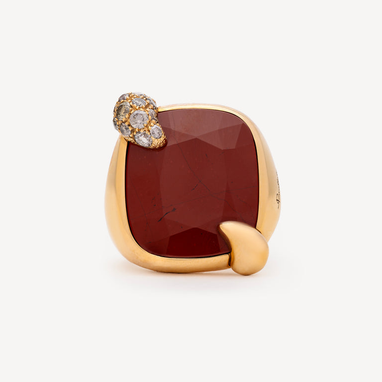 Pomellato medium ring set with a central jasper and a claw paved with brown diamonds.
