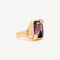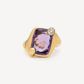 Yellow gold mini ring set with a central amethyst and a diamond-paved claw.