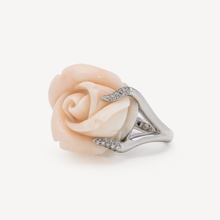 Pink ring in white gold and angel-skin coral, set with white diamonds.