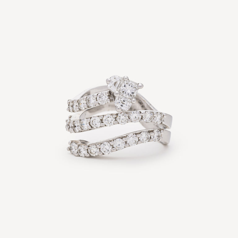 Three-turn white gold snake ring, finished with a heart and entirely paved with white diamonds.