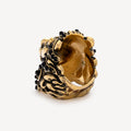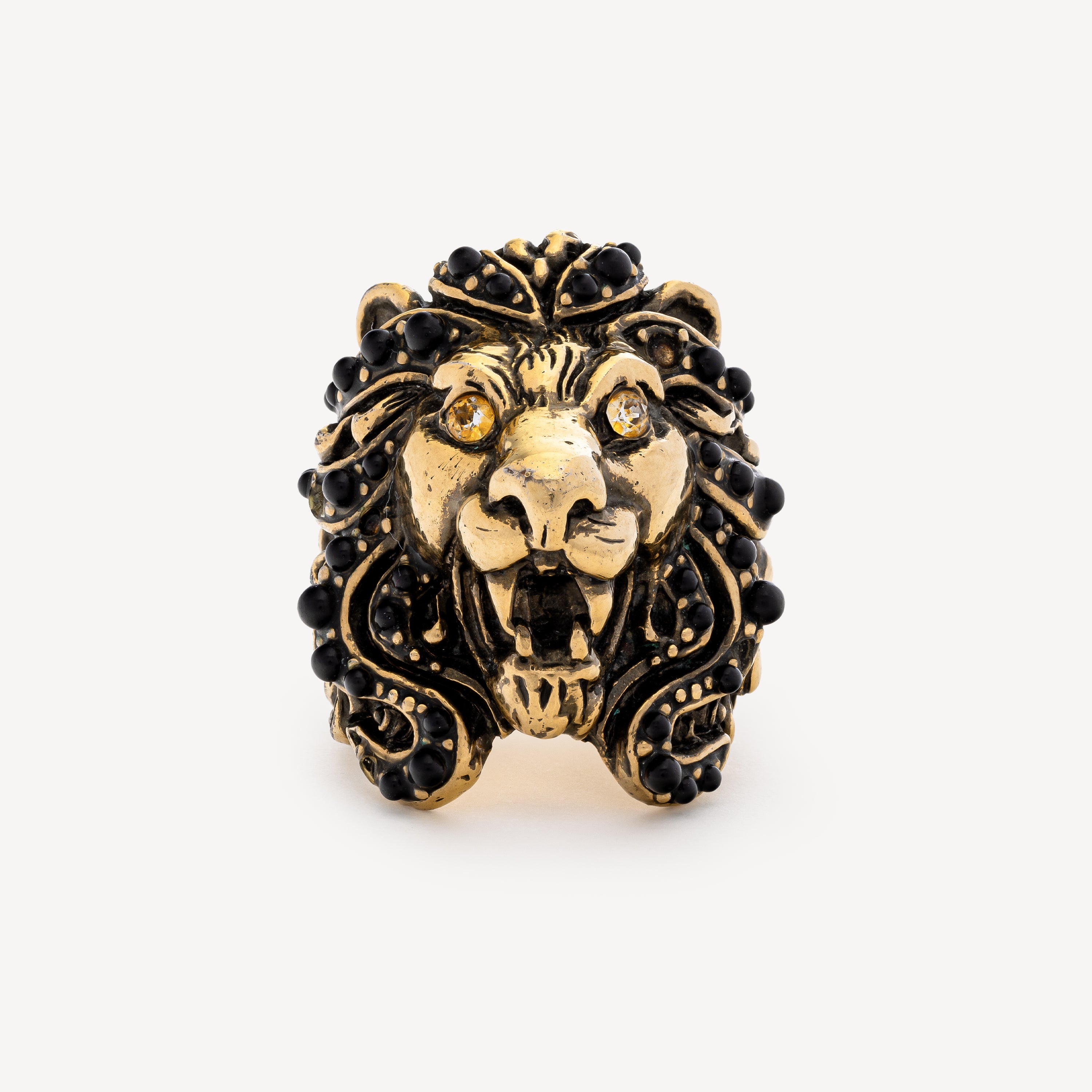 Gold-finish metal lion head ring with black pearls and orange crystals.
