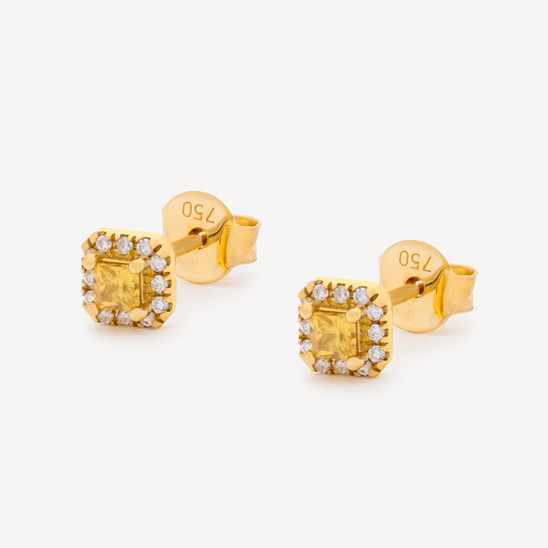 Fortuna yellow sapphire earrings are crafted in 18-carat yellow gold and set off by sparkling diamonds. Yellow sapphire is considered a stone of joy and prosperity, while white diamonds embody purity and inner strength.