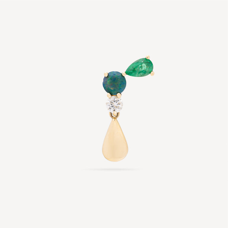 This earring is in 14-carat yellow gold and set with black Ethiopian opals, bright green emeralds and diamonds. A delicate pear dangles from the bottom, creating a subtle movement.