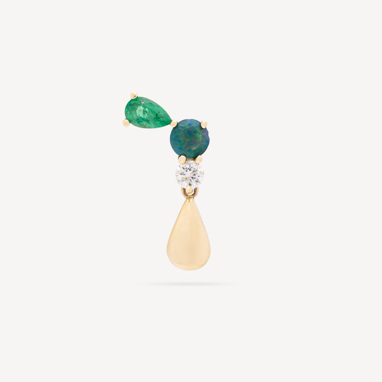 This earring is in 14-carat yellow gold and set with black Ethiopian opals, bright green emeralds and diamonds. A delicate pear dangles from the bottom, creating a subtle movement.