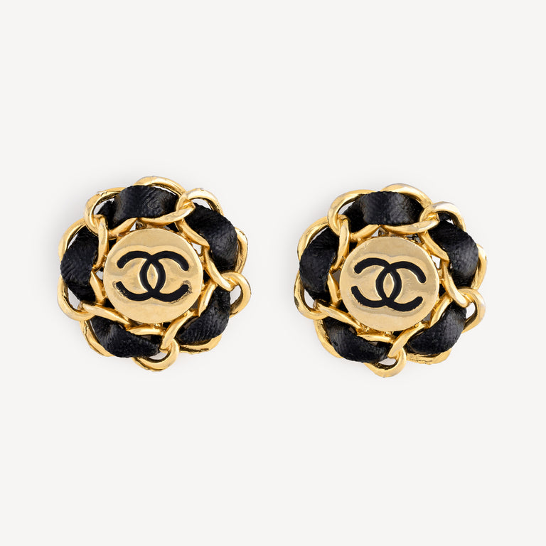 Vintage clip earrings in gold-finish metal and braided leather. Central Chanel logo.