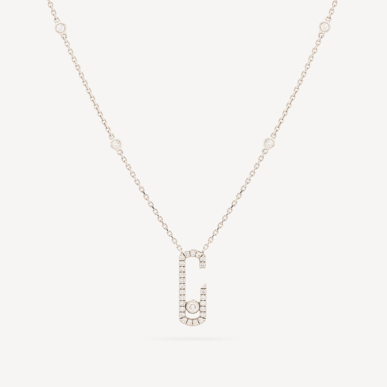 White gold necklace with move pendant paved with white diamonds.