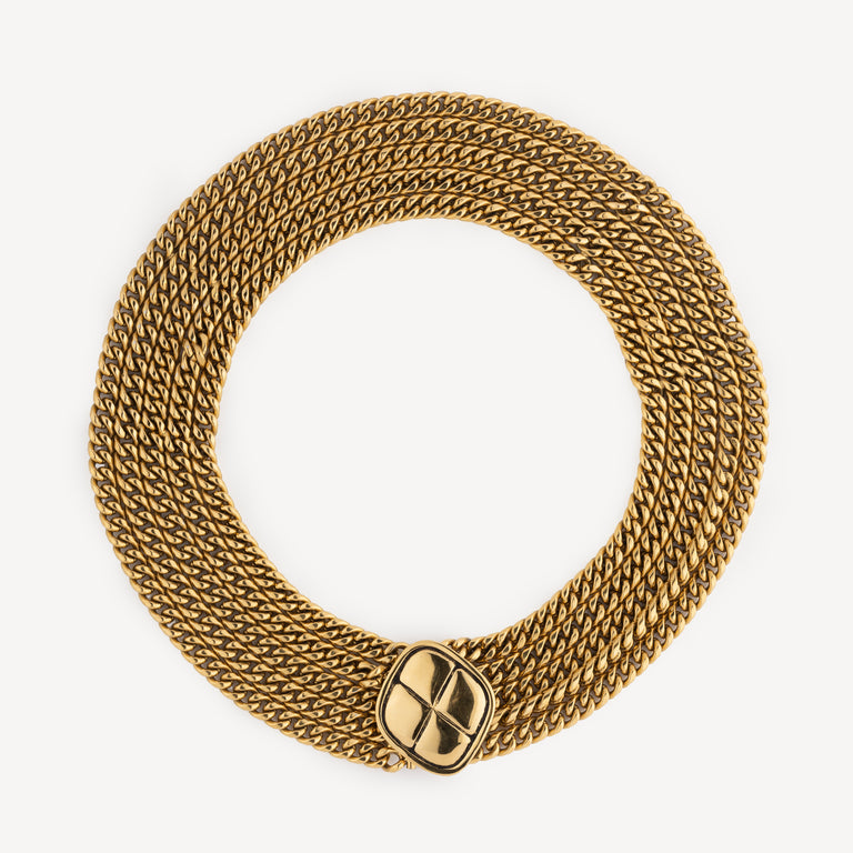 Vintage choker necklace in gold-finish metal featuring five rows of chains with diamond-shaped medallion clasp. Can be worn on the front or back.
