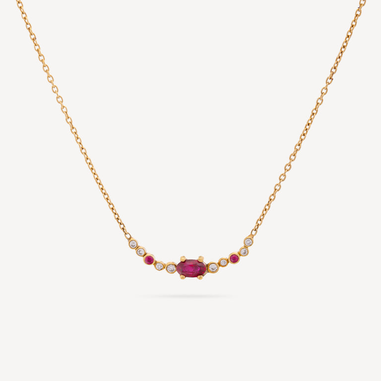 The Seraphina Wings Ruby necklace is crafted in 18-carat yellow gold and delicately enhanced by white diamonds and rubies. The white diamond embodies purity and inner strength, while the ruby stimulates the heart's energy, reinforces courage and inspires intense love.