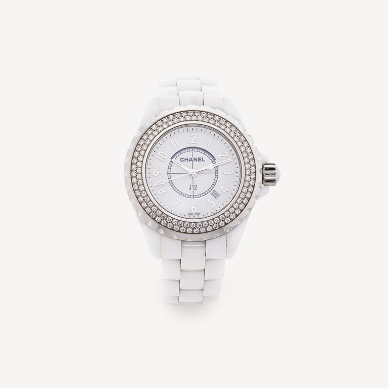 Chanel J12 watch with white high-resistance ceramic and steel case, fixed steel bezel set with two rows of white diamonds, screw-down steel crown with white high-resistance ceramic cabochon, white lacquered dial, white high-resistance ceramic bracelet and steel triple folding clasp. Quartz movement. Water-resistance 200m.