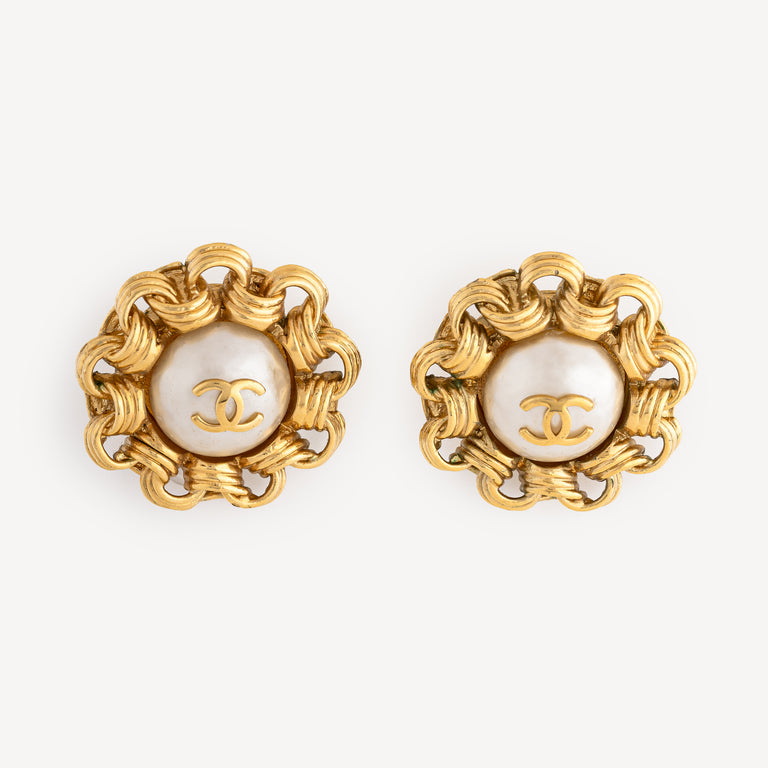 Vintage clip earrings in gold-finish metal with central faux pearl and Chanel logo.