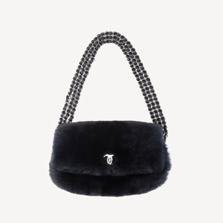 Chanel midnight blue flap bag in rabbit fur, limited edition. Triple blue strap covered with silver chain. Chanel fabric-lined interior with 2 pockets. Sold with its original certificate of authenticity.
