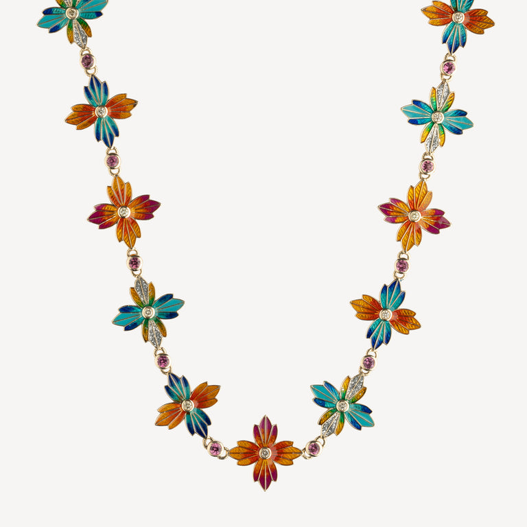 - Materials: Yellow gold, Enamel, White sapphire, Rhodolite