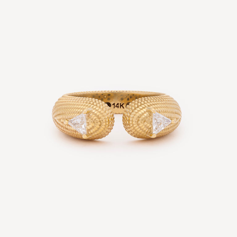 The Écaille ring wraps around your finger like a shell of matte gold, adorned with scales and topped with two sparkling, triangular-shaped diamonds. A stone of purity and energy, white diamonds help balance emotions and purify the aura.