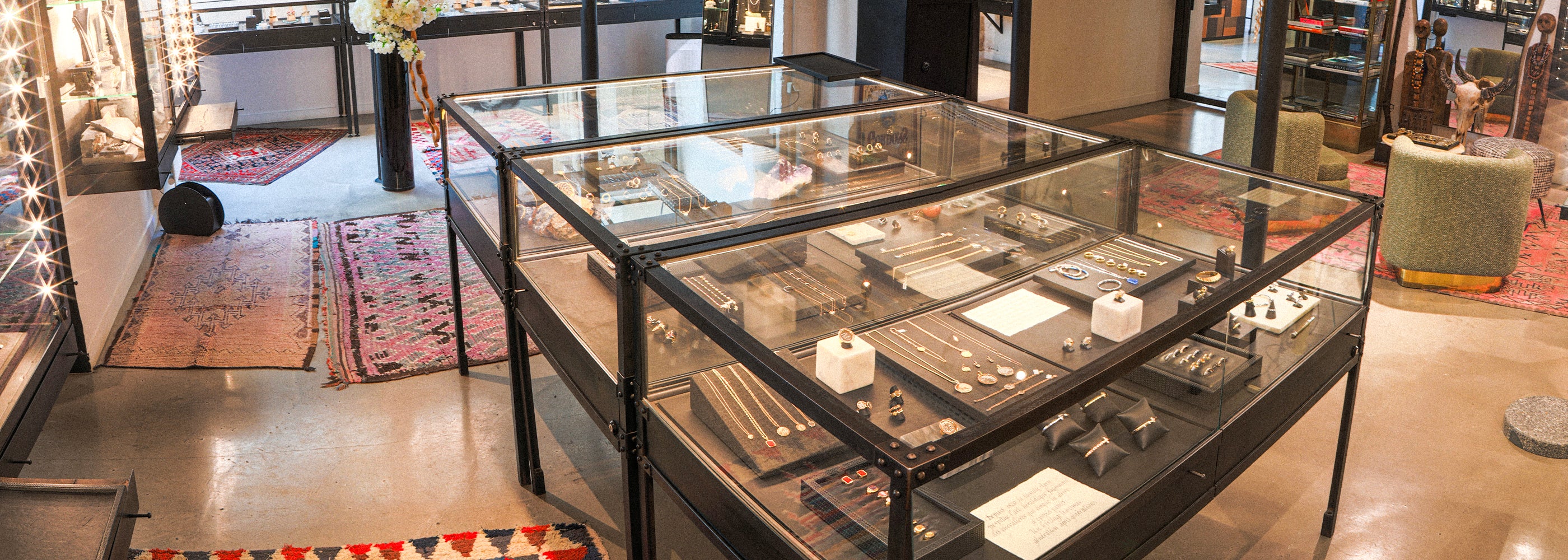 Elegant display cases and dark wood shelving welcome visitors into an intimate and creative atmosphere. Mad Lords presents its latest discoveries here, with each piece of jewelry telling its own unique story. Come and discover this magical place where luxury and craftsmanship meet, offering a journey to the heart of elegance and creativity.